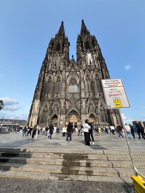 Seitsemältä suuntasimme junalla Hampuriin, jossa söimme herkullista vegaanista currywurstia ja donitseja. Hampurikin oli tällä kerralla vain pysähdyspaikka, sillä jatkoimme jälleen matkaa kohti Kölniä. Junassa luimme lehtiä ja kirjoja sekä herkuttelimme Apfelschorlella. Perillä ensimmäinen näkemämme nähtävyys oli sykähdyttävä Kölnin tuomiokirkko, jota emme kuitenkaan kerenneet sen paremmin tutkimaan, sillä piti lähteä etsimään hostellia. Hostellille päästyämme saimme tietää, että saksalaiset kaupat eivät olleet auki, koska oli helluntai. Ne eivät olleet auki myöskään maanantaina, koska Saksassa vietetään helluntaita kaksi päivää, joten olimme auki olevien ravintoloiden armoilla. Olimme valinneet hostellin sen ruuanlaittomahdollisuuksien vuoksi. Onnena onnettomuudessa tilasimme elämämme parasta pizzaa ja kävimme nauttimassa illasta espanjalaistyylisen baarin terassilla.