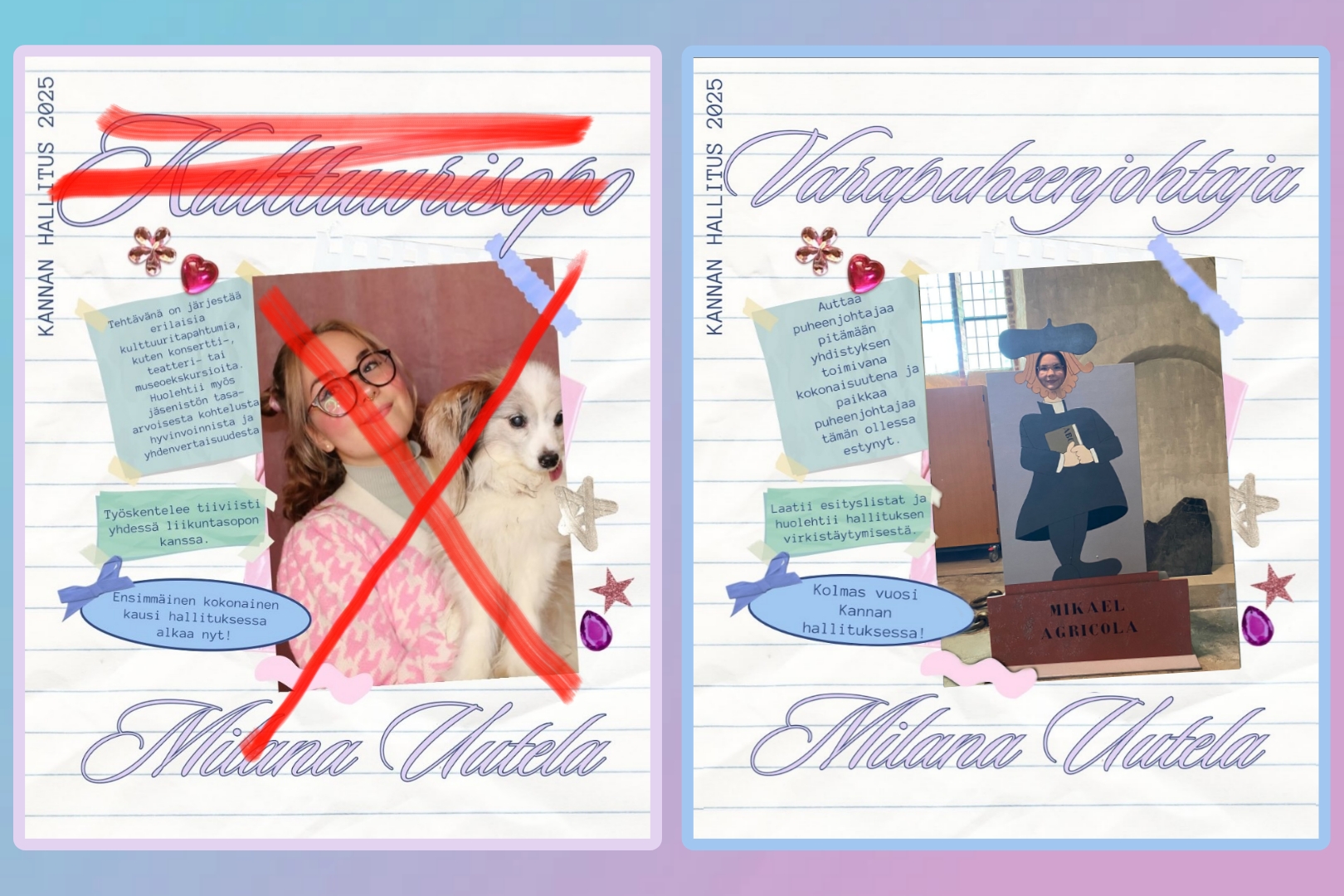 Osa tuntee minut Kannan kulttuurisopona, sillä ehdinkin hoitamaan tehtävää aika lailla tasan vuoden. Raskain sydämin kuitenkin jouduin luopumaan siitä. Täytettävänä olivat nimittäin varapuheenjohtajan suuren suuret saappaat. Uusi tehtävä on edellistä vastuullisempi, mutta myös osin vapaampi. Tehtävien määrä luultavasti kasvaa, mutta uudet tehtävät ovat luonteeltaan erilaisia, mikä voi olla kivaa vaihtelua.