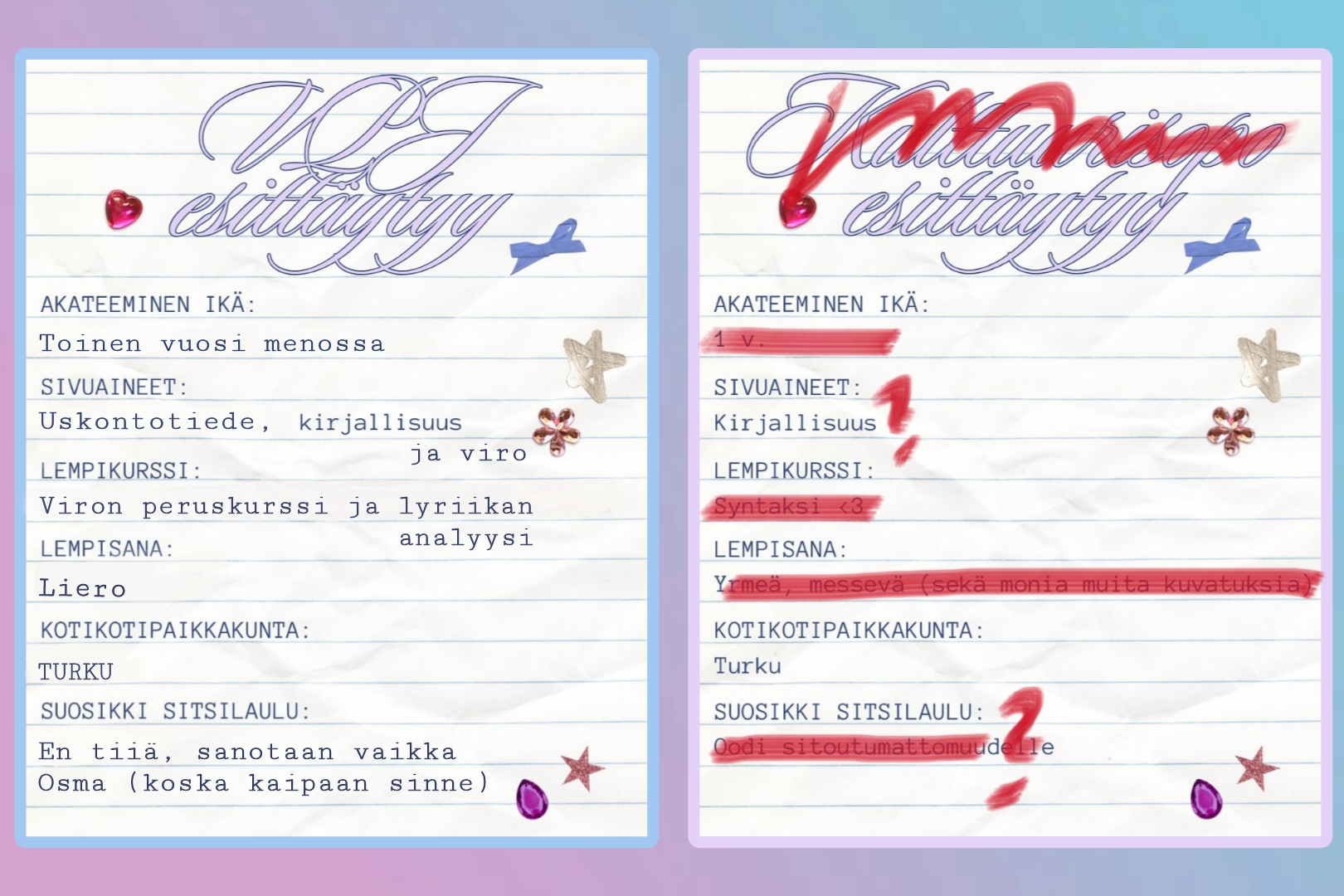Omaksi ilokseni Loppukevennyksenä esittelen uuden ja paremman version itsestäni. En ihan totta taida olla enää sama ihminen kuin hallituskauden alussa. Vastaanpa siis päivitetysti vpj:nä Instagramissa julkaistuihin kysymyksiin, joihin muinoin vastasin sopona.